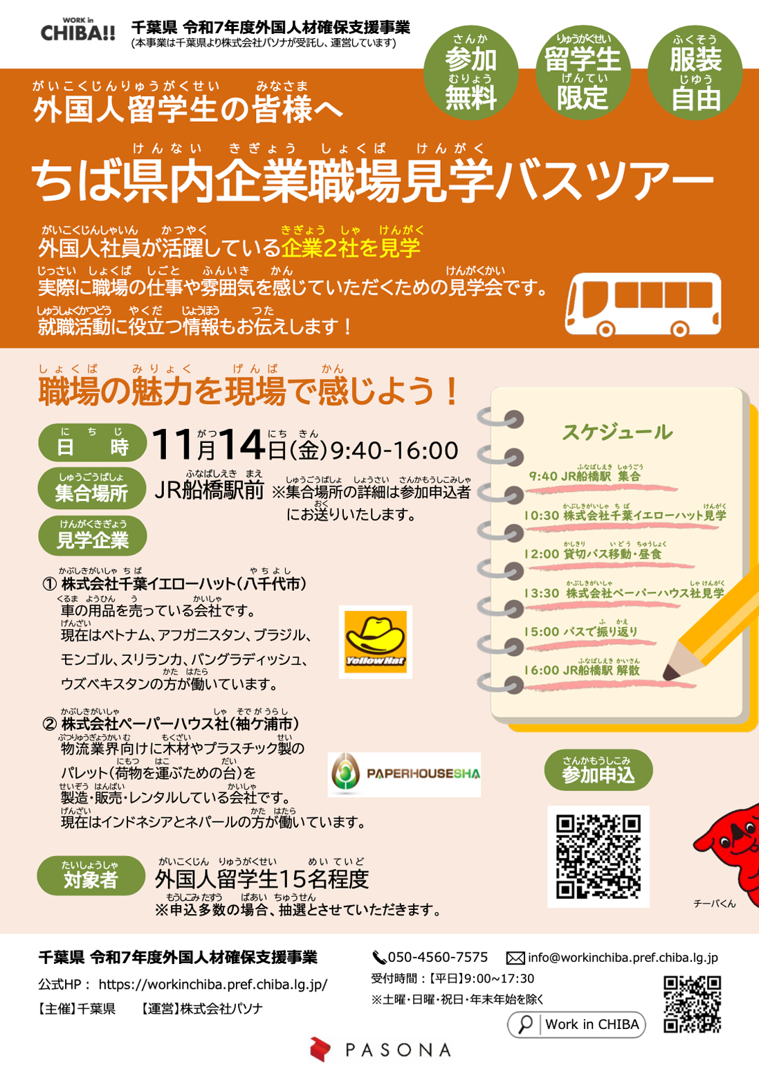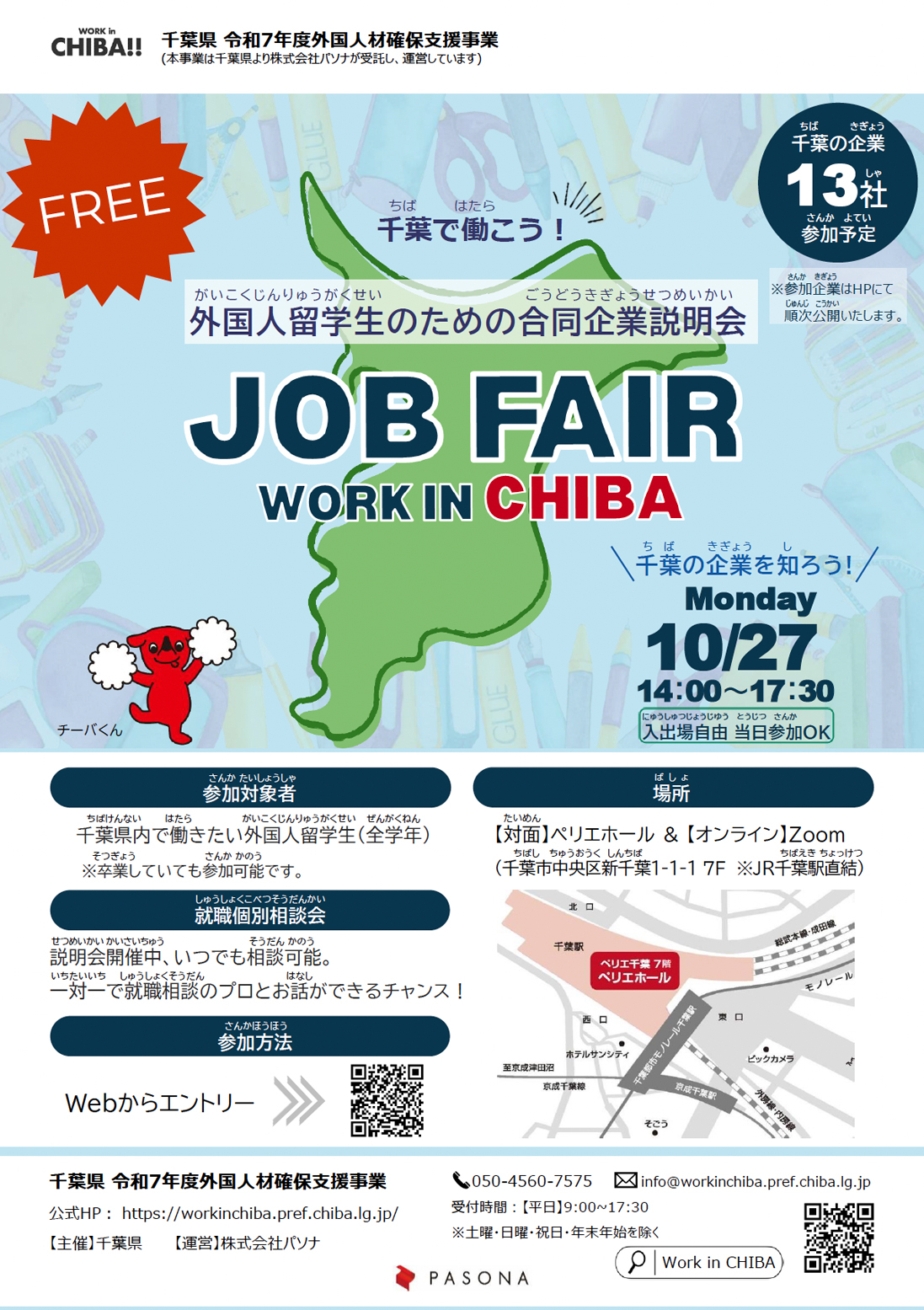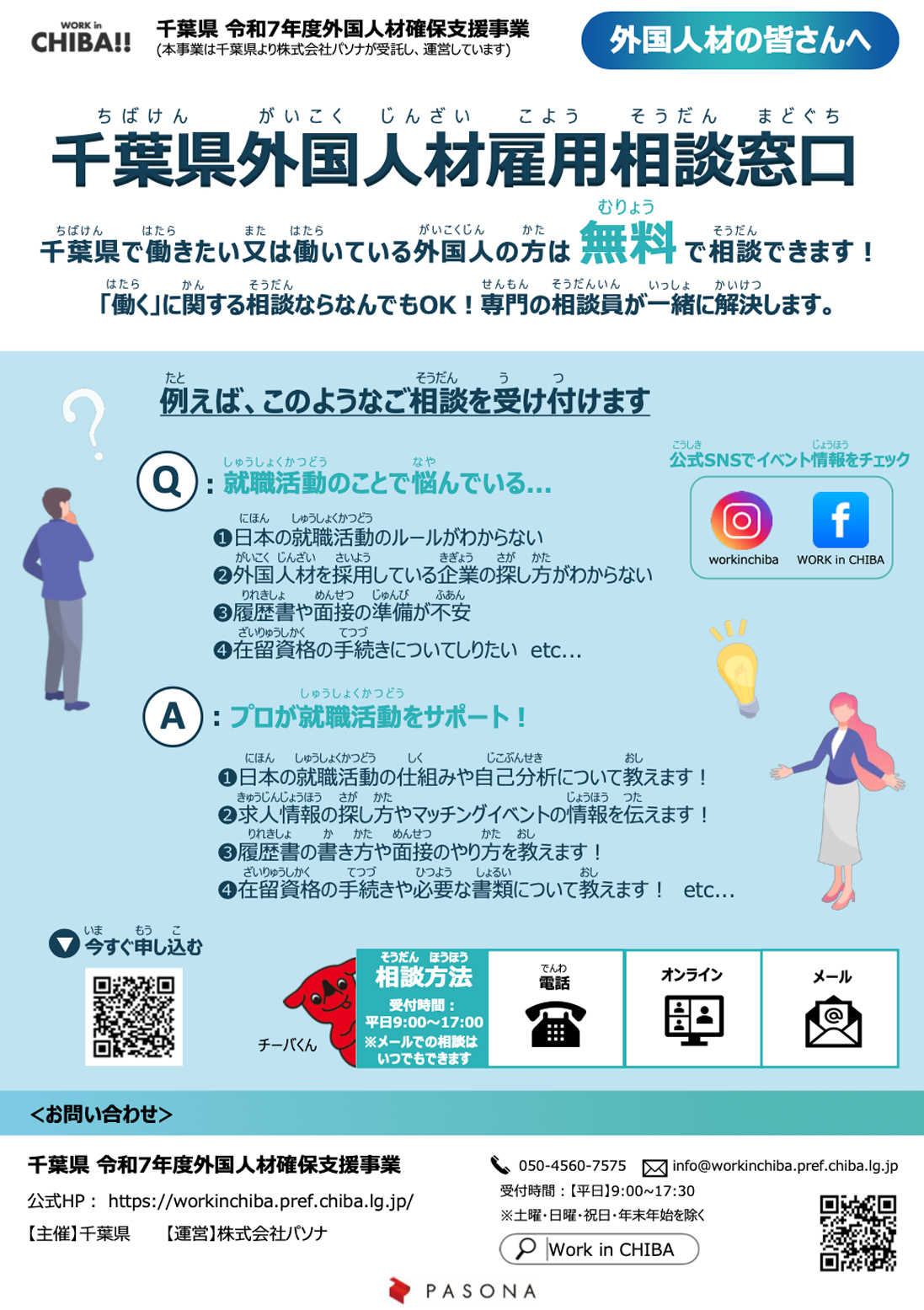 外国人留学生等の千葉で働きたい外国人、または千葉で働いている外国人のみなさま、仕事のさがしかた、履歴書の書きかた、面接のやりかた、就職活動のすすめかたなど、「働くこと」に関するこまっていることについて、相談できます。